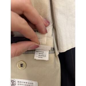 Brunello Cucinelli men's navy pinstripe sport coat blazer. Italian size 50 (US 40R). 100% cotton shell with cupro lining. Features signature contrasting elbow patches, three-button closure, notch lapel, and flap pockets. Partially lined. Made in Italy.