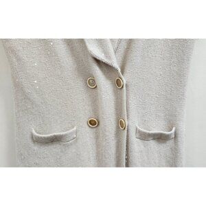 The Brunello Cucinelli Cashmere Sleeveless Shawl Cardigan is a luxurious and stylish piece of women's clothing. Made from high-quality cashmere material, this beige cardigan features a speckled knit design that adds a touch of sophistication to any outfit. With a sleeveless style and double closure, this cardigan is perfect for layering over a variety of ensembles. The size M and regular fit make it a versatile and timeless addition to any wardrobe.