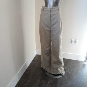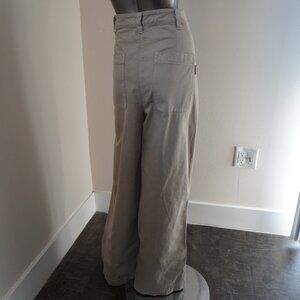 A chic pair of wide leg, high waisted khaki twill jeans with a monili tab on the rear pocket.