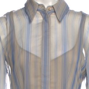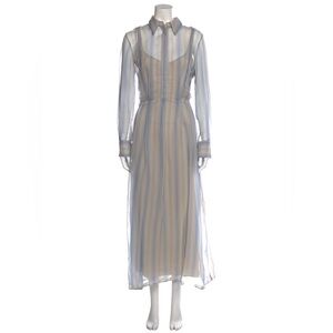 Top Italian luxury designer Brunello Cucinelli!!! A striped silk maxi dress, subtle blue and taupe variegated stripe, in a shirtdress style, super classy, and elegant, yet very understated chic that this luxury brand is known for. The organza overlay features a slip dress underneath. Excellent condition, retailed over $2700 in the Brunello Cucinelli boutique. Size Medium - See last photo for measurement and fabric details. Bought in new condition without tags and unworn. offering at fraction of my purchase price! Photos are of actual dress.