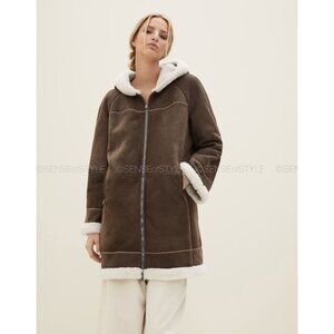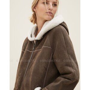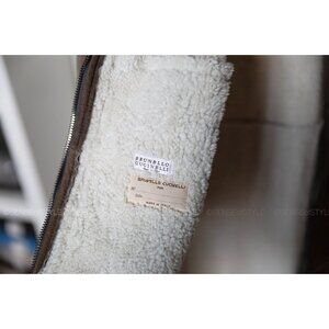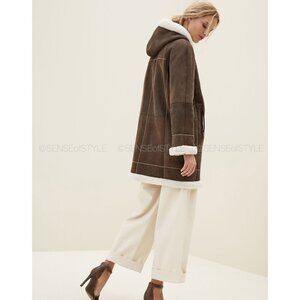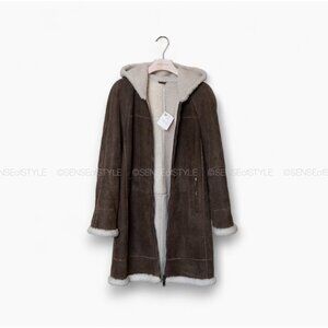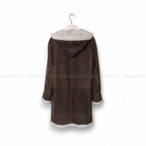 This Brunello Cucinelli women’s hooded leather fur coat embodies refined luxury and modern sophistication. Expertly handmade in Italy, it is crafted from premium leather with soft shearling fur for exceptional warmth and comfort during the winter season. The design features an extended mid-length silhouette that flatters the figure while providing full coverage against the cold. Subtle golden-tone Monili bead embroidery adds a distinctive shimmer, enhancing the coat’s elegant aesthetic without overpowering its natural beauty. The hood introduces a functional touch, seamlessly blending practicality with timeless style. In a rich solid brown shade, this coat is ideal for casual yet elevated occasions, offering a perfect balance of warmth, comfort, and understated glamour.