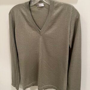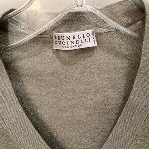 Green, sparkle sweater by Brunello Cucinelli. Size L. The fabric is 51% cashmere, 22% silk, 20% polyamide, and 7% metallic polyester. Very good condition.