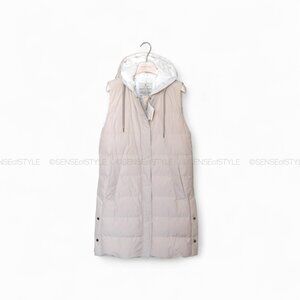 The Brunello Cucinelli extended-length puffer coat is a chic, sleeveless design that combines functionality with elegance. Crafted in a versatile neutral beige, it pairs effortlessly with any outfit. The back features dazzling golden-toned monili embroidery, adding a touch of glamour to the piece. Filled with down feathers, this coat is lightweight yet warm, making it perfect for cooler weather. It comes with a zipper and snap button closure, two side pockets, and a drawstring at the hood for added comfort and style.
