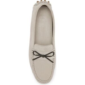 A nubby rubber driving sole grounds this refined Italian loafer crafted of velvety suede and topped with a monili-beaded bow.