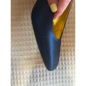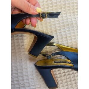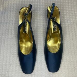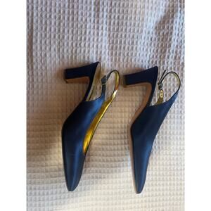 Bruno Magli Couture Navy Satin Sling Back Square Toe Kitty Heels Gold Detail 9.5
