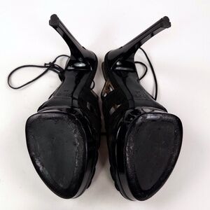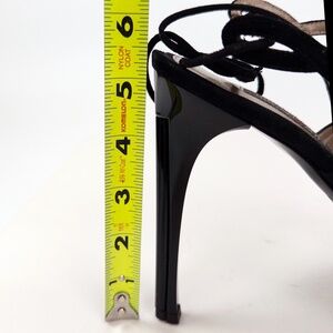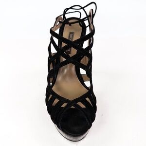 Bruno Magli Empress Suede Platform Latticework Strap Sandals. Black. Semi-pointed toe. Platform. Single suede lace ties around the ankle and heel . Ships with authenticity card, box and extra set of heel tips. No dust bag.