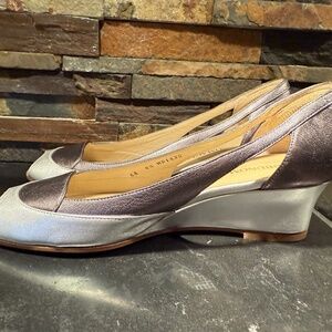 Bruno Magli Peep-Toe Wedge Heel Pump size US 6.5 AA Metallic Silver Gray Leather