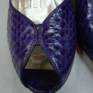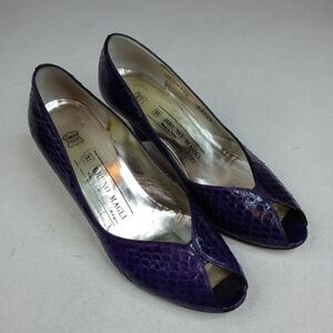 Bruno Magli Women Shoe Pumps 2.5" Heel Purple Snake Print Leather open toe sz 7B. Condition is "Pre-owned". Shipped with USPS Priority Mail. 291pem