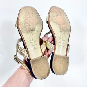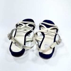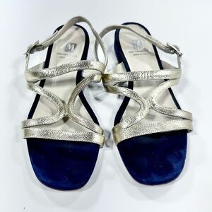 Bruno Magli navy and gold strappy kitten heel sandal 37.5. Some dirt on toe beds and slight impressions, pictured.