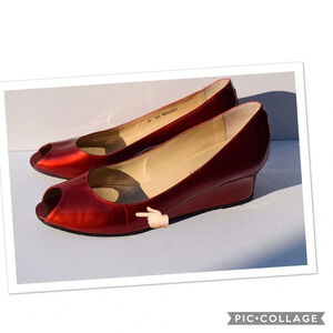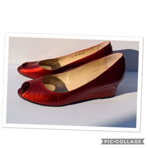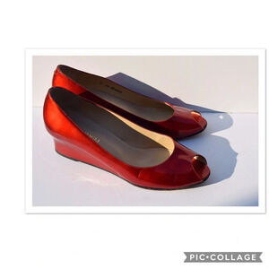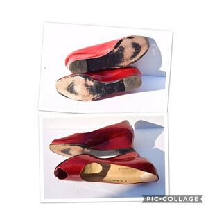 near peep toe shows tiny creasing (pic). Wear to soles.