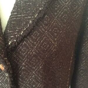 Beautiful Bruno Manetti lightweight dark brown jacket with gold threading throughout. Fringe edging. Two small front pockets. Three button closure. The buttons are beautiful old fashion cameos. Jacket is unlined. Fabric is 85% Virgin Wool, 10% Viscose and 5% Polyester. Made in Italy. In excellent worn condition.