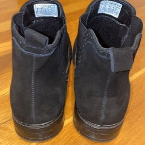 Lightly worn men’s chelsea boot, black suede. Very nice suede for price, size 11. A little bit of dirt on left shoe as shown in picture but can be easily cleaned with a brush. They have just been sitting in my closet.