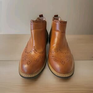 The boots are a classic Chelsea design, featuring elastic side panels and a pull tab on the heel for easy slip-on and off. They also incorporate brogue detailing (perforations) on the toe cap and along the seams, a feature often seen in dress shoes. These Bruno Marc shoes are new with some light defects. See images. May just need a light cleaning to femove defects. Comfortable sz. 10.5. Great for work or parties and events. Great style.