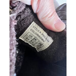 Pre-owned Bruno Marc “Philly-10” boots in excellent used condition. These combat-style lace-up boots feature a rich brown faux leather exterior with decorative side buckles, inner side zipper for easy wear, and cushioned floral-print insoles. Style meets utility with a durable treaded sole and fleece-like lining for comfort.