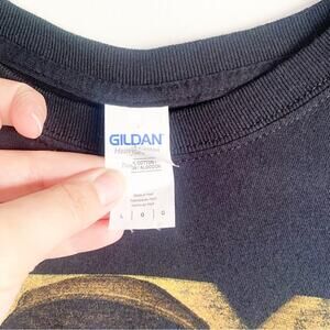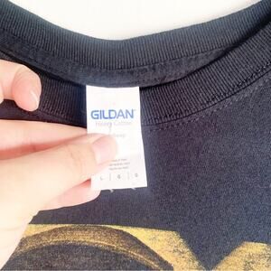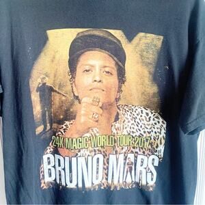 Bruno Mars 24K Magic World Tour 2017 Concert T-Shirt Graphic Tee Music Gildan Size Large {L}. Black, short sleeve t-shirt. Bruno Mars graphic on front. Concert city names on back. Good, preowned condition. Graphic is patchy in some places like on the words “Bruno Mars,” but I think it is the look/style of this t shirt. Top gildan tag is slit. Gildan brand t-shirt.