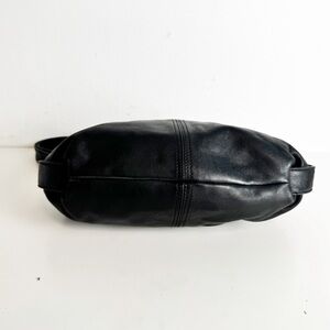 Elegant black leather shoulder bag, perfect for any occasion. Features a sleek design with a comfortable strap. Lined in plaid and has three compartments with multiple pockets
