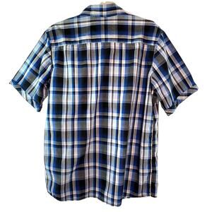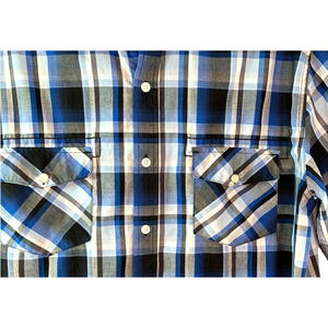 Bruno Shirt Mens Medium Blue Plaid Short Sleeve Pearl Snap Flap Pockets...button down shirt is in good pre-owned condition...no stains or holes...cotton blend...pearl snap front pockets