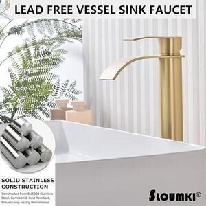 Brushed Gold Vessel Sink Faucet, High Bathroom Sink Faucet, High Waterfall Bathroom Faucet, Single Handle Basin Faucet, Come with Water Hose and Metal Pop Up Drain Without Overflow Hole NEW IN BOX SHIPS QUICK