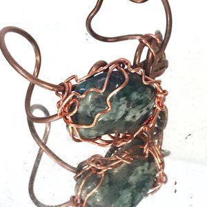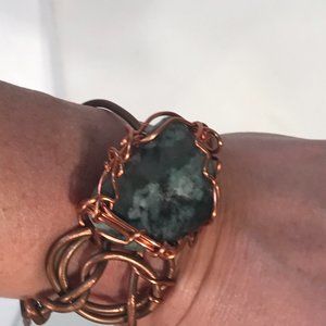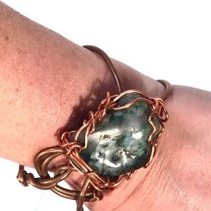 Brutalist Huge Genuine Emerald Gemstone Wire Wrapped Solid Copper Cuff Rustic