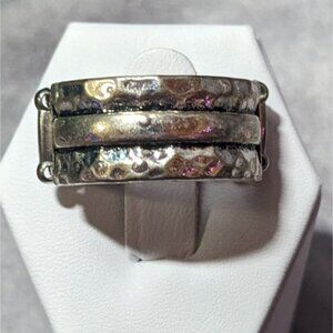 This stunning Brutalist stretch ring features a silver tone finish and fits size 7. Its unique design makes it a bold statement piece for any outfit.