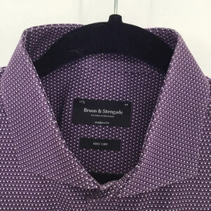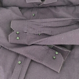 Lovely Men’s long sleeve in deep eggplant color w/ a small background pattern. Spread collar with print tone in tone buttonholes.