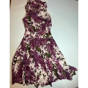 Bryan Bradley Floral Print 100% Silk Dress Sleeveless Purple halter Fit Flare M