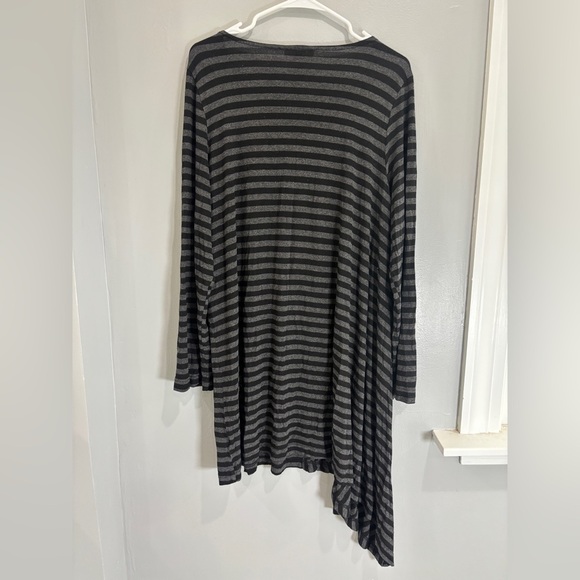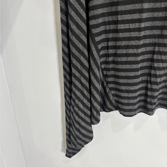 Bryn Walker Asymmetrical Hem Striped Long Sleeve Top Shirt Blouse Pullover M/L. Viscose spandex blend. No size tag so please use measurements to see if this would work for you. Could also depend on how you want to wear it. Looks like it would fit a medium for an oversized dress or a large for a tunic style shirt. One small hole near the back neckline but barely noticeable. Otherwise very good preowned condition.