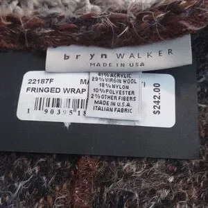 Bryn Walker has created the most stunning open fringed wrap poncho. Comprised of 41% acrylic 29% virgin wool 18% nylon 10% polyester and 2% other fibers. Made in the USA of Italian fabric. These do come in different sizes but they honestly are all the same size and in a deconstructed design, so one size fits most. Contact us with questions. New merchandise arrives daily. Bundle this with one of our other 1,000 items and save even more.