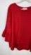Roomy linen top in bright red features a high-low hemline, round neckline and 3/4 sleeves that end in large ruffles. Large inverted pleat in back. Easy pullover styling.