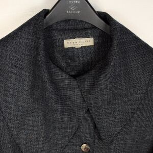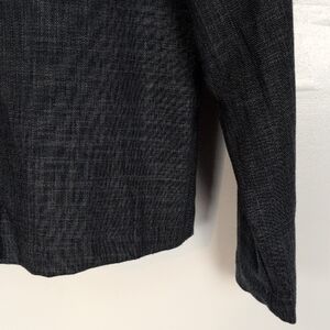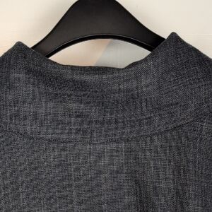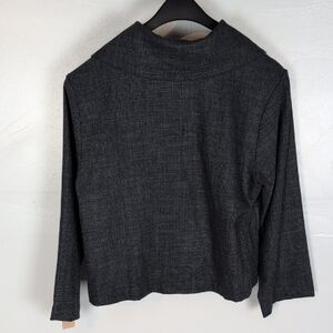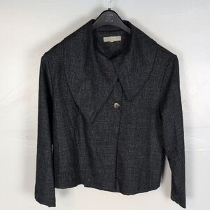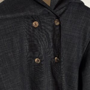 Gray.  Oversized, fold-over collar.  Long, wide sleeves.  Four button closure at the top half of the jacket.  Lightweight enough to be worn as a top if desired.  Excellent condition -- no stains, holes, or fraying.  Laid flat pit-to-pit: 22in. Shoulder to hem: 22in.