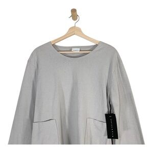 features: Cotton jersey knit fabric. Boat neckline. Long sleeves. Oversized boxy fit. Front pouch pockets. Pull over.