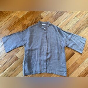 Bryn Walker women’s gray linen 3/4 sleeve kimono style tunic top, size XL. This has an oversized boxy look to it. Good condition however there is a button missing on the garment. You can’t tell because the buttons are hidden under a flap. The care tag is also missing from garment. No rips, holes, stains or odors. Please see photos for item details/dimensions. Some photos may appear different in color due to lighting. Ships from smoke-free home.