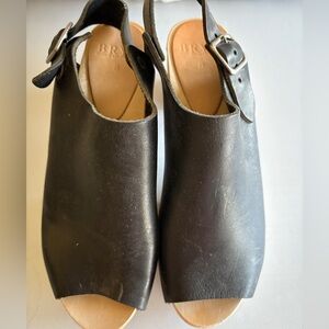 Elegant black leather clogs by Bryr. Features a sturdy wooden sole. Ideal for versatile wear. Worn a few times but in good condition.