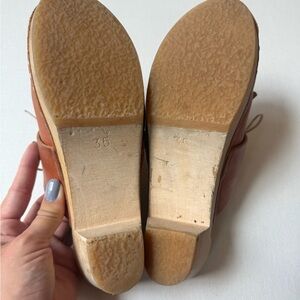 Size 35. I loved these but am not reaching for them as much anymore. So cute and always got so many compliments. Minor wear on the tie part of the clog and around the wooden parts which are shown in photos