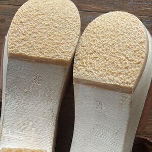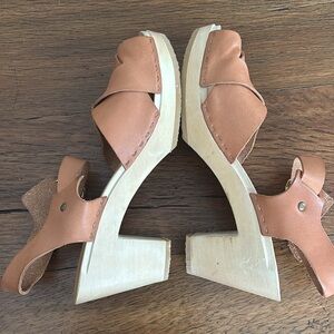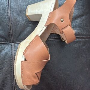 Stylish Bryr sandals with a tan leather upper. Features a sturdy wooden heel and adjustable ankle strap.