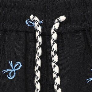 Black base, blue and white embroidery decoration, drawstring design, unique and fashionable.