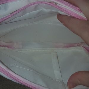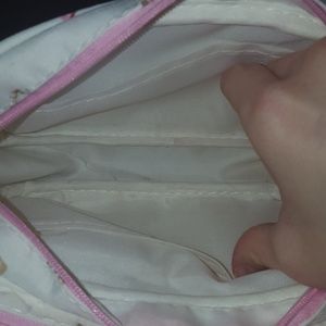 Makeup bag from Japanese lolita brand Baby the Stars Shine Bright. Teddy bear, star, card, bow, and crown print in pink, white, and brown. Super cute, but has some marks from makeup storage on the inside. Exterior bottom has barely visible scuffs; all marks should come out with a washing, but price is marked down to reflect wear. Used once.