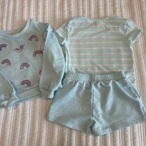 Adorable light blue kids' outfit set. Includes a sweatshirt with rainbow design and striped shorts set. Perfect for casual wear. Sweatshirt has not been worn..still has tags