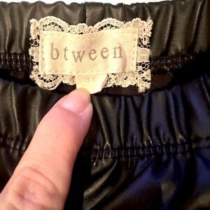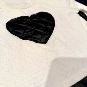 Excellent, nearly new condition. Pants worn once, shirt never worn. Black faux leather flare pants with matching long sleeve white shirt with black heart. Shirt has textured pattern.