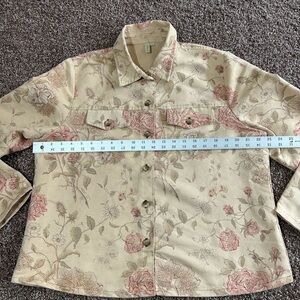 This utility jacket features a charming cream base adorned with delicate pink floral patterns, offering a romantic touch to its casual style. The relaxed fit and long sleeves make it a versatile addition to your wardrobe, perfect for layering in any season. Its soft, textured fabric ensures comfort while maintaining a chic appearance.