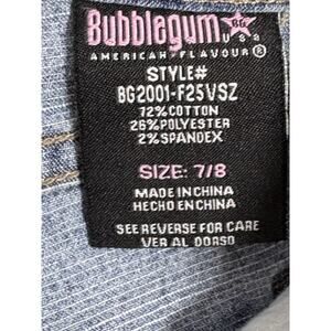 The Bubble Gum USA Short Shorts are denim blue jean shorts designed for juniors in size 7/8. These casual shorts feature a low rise, flat front, and a regular fit, making them perfect for a comfortable and stylish look. Made from a cotton blend fabric, they are machine washable and have a 2.0-inch inseam, ideal for the summer and spring seasons. The USA-themed design adds a fun and trendy touch to these versatile shorts from Bubble Gum USA.