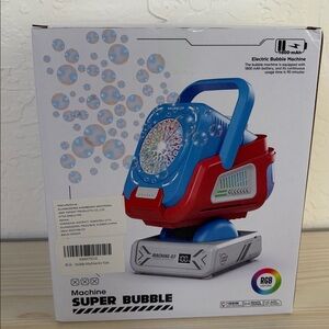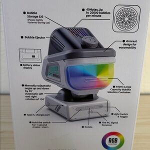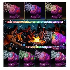 Bubble machine with remote control. Features pink and purple design. Perfect for parties and events. New in box