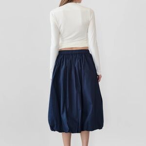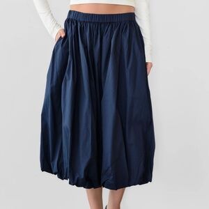 This bubble skirt is a playful midi-length bubble skirt. It features an elasticated waist for a comfortable and adjustable fit. The length and bubble effect hem add volume and movement to the silhouette. Pair this skirt with a cropped, fitted tee and flats for a casual yet elevated look. Run true to size.