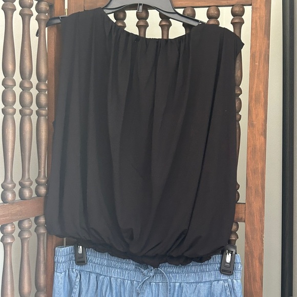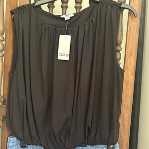 Chic black blouse by Bar III. Sleeveless design with gathered neckline and bubble hemline. Chic top ideal Ideal versatile styling.