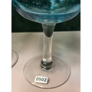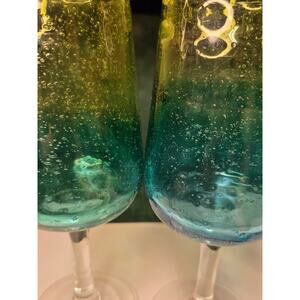 Two Ombre Goblets most likely Recycled Glass Hand Blown in Mexico. 9 in. tall. Blue / green / yellow with a large bowl. There are good sized bubbles in the bowl, but the stem is clear and looks like it was added to the bowl. This can be indicative of a Mexican piece. Pictures are accurate. This is the item you will receive.