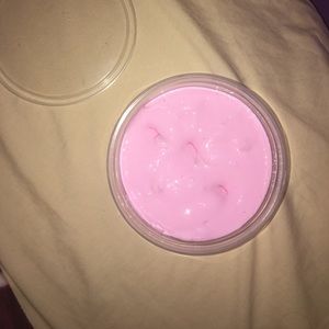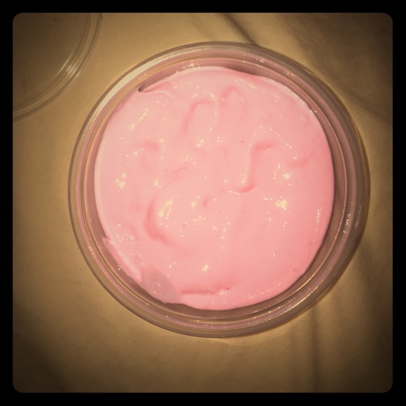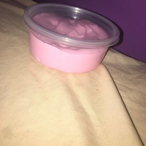It's a bubblegum pink colored! It spreads pretty good! Super stretchy and soft! Comes with extras!!