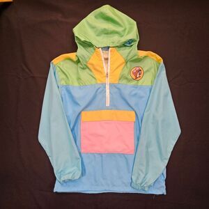 This Buc-Ees women's pullover windbreaker jacket features a vibrant colorblock design in pastel green, yellow, blue, and pink, making it a standout piece for casual and outdoor wear. The jacket has a half-zip front closure and an attached hood, providing easy ventilation and weather protection. A large front pocket with a velcro flap adds both functionality and style, perfect for storing essentials on the go. The elastic cuffs ensure a comfortable fit while blocking out wind.