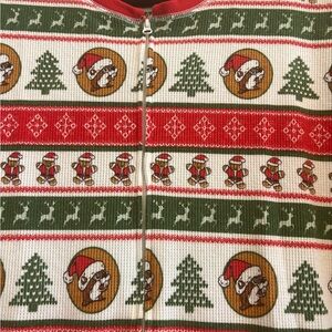 Cozy onesie with Christmas patterns. Features red, green, and white colors. Perfect for holiday lounging.