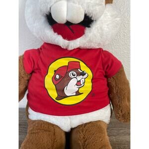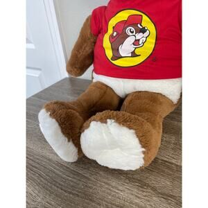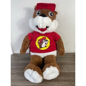 Features: Embroidered eyes, Buc-ee's logo shirt, red cap, soft plush body