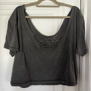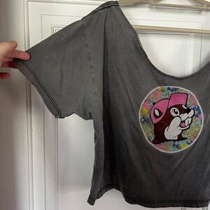 Comfy and fun Buc-ee’s cropped graphic t-shirt 🦫 in soft charcoal gray. Features the iconic Buc-ee’s beaver wearing a pink hat 💕, surrounded by a colorful tropical floral background 🌸🌿. The oversized scoop neckline and large cutout back give it a relaxed, slouchy vibe. Slightly faded fabric for that vintage feel 🎶.